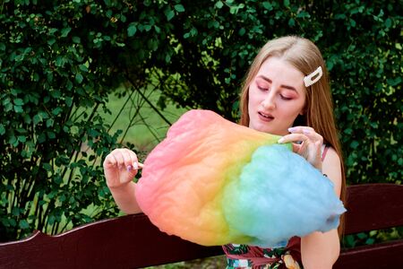 Happy joyful beautiful young woman with candy floss in the park at summer.
