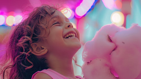 A little girl with a big smile and happy eyes is enjoying cotton candy at the carnival. Her nose wrinkles as she takes a bite, and her ears stick out from her hairstyle AIG50