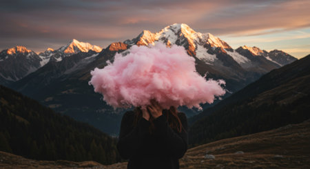 A surreal image of a person with a vibrant pink smoke cloud head, framed by majestic mountains glowing at sunset. Captures imagination, identity, and freedom.