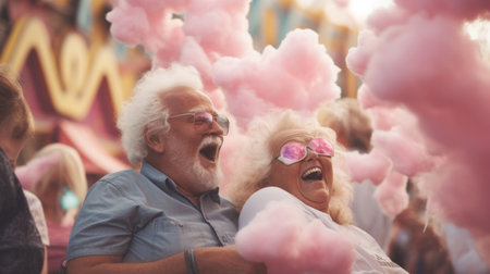 Generative AI Grandparents indulging in cotton candy while watching a lively street performance in the amusement park