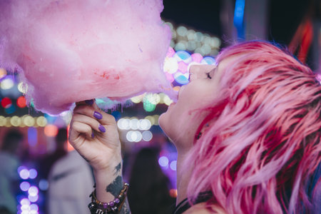 The woman, with a smile on her face and violet cotton candy in hand, is enjoying the carnival event, happy and having fun while her eyelashes flutter with excitement AIG50
