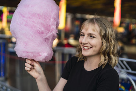 A young cheerful Caucasian female eating cotton candy at an amusement park