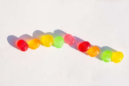 Colorful lollipops on a white background. Macro photography of beautiful candies in the sunlight. Beautiful juicy lollipops. The view from the top. White isolated background. Bright sunlight.