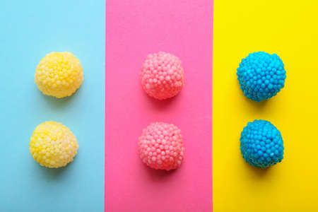 Flat lay of colorful gummy sweets on pink and yellow background