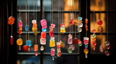 Colorful glass candy decorations hanging against a window
