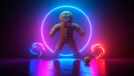 Festive gingerbread man surrounded by glowing neon circles and candy swirls in vibrant purple, blue, and pink lighting. Perfect for holiday marketing, Christmas campaigns, and seasonal content.
