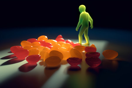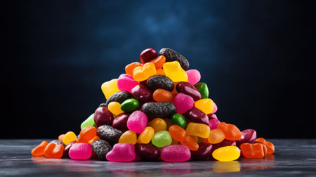 Bright and colorful gummy candies coated with sparkling sugar sit dramatically against a dark background, evoking feelings of joy and indulgence perfect for any celebration.