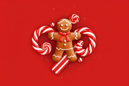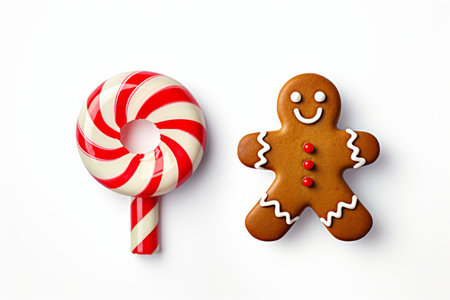 This delightful image captures a festive set featuring a candy cane and a gingerbread man cookie, meticulously presented against a white color cut-off background. The front view, studio lighting, high contrast, and balanced object focus create a visually appealing composition that radiates the holiday spirit. Perfect for holiday-themed designs, festive decorations, or any project that celebrates the sweetness of the season