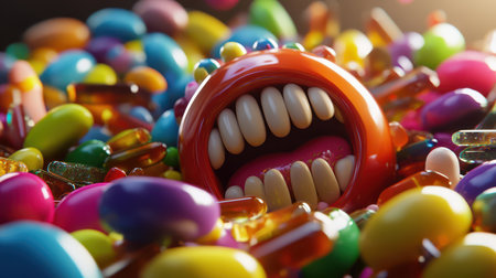 A vibrant mix of assorted candies surrounds a quirky character with a wide toothy grin creating a fun and whimsical atmosphere.