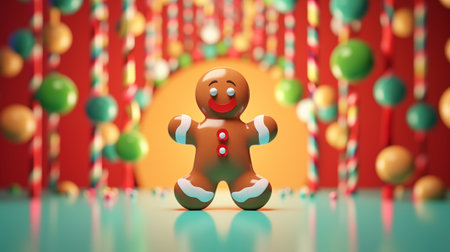 Gingerbread man on a red background with balloons. 3d rendering