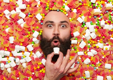 Bearded guy surrounded with sweet stuff