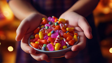 Hands holding a handful of smiling candies, capturing the delight of indulging in sweet treats.