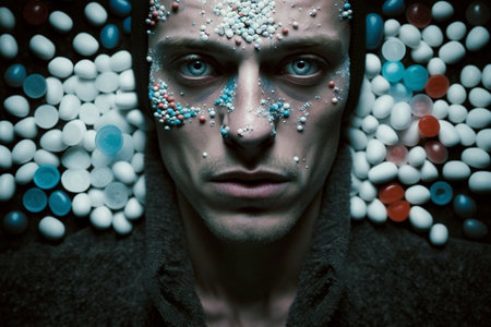 Fantasy portrait of a cheerful man covered in festive sweets, lollipops and colorful candy