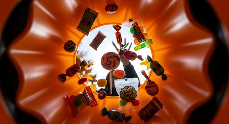 A creative view from inside an orange Halloween pumpkin bucket, looking up as a variety of colorful candies fall down. The background shows a blurred figure, representing the act of trick-or-treating.