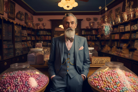 Western gentleman sweet shop interior. Alone elder person with hands in pants. Generate Ai