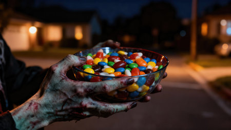 Halloween. A close up shot of zombie hands offering a bowl of candy on Halloween night. The scene is set outdoors with a blurred background of houses and street.