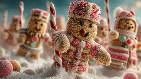 A vibrant display of gingerbread men surrounded by colorful holiday decorations, including candies and ornaments, perfect for capturing festive spirit.