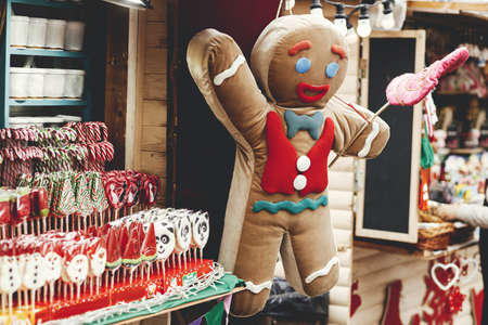 Stylish big christmas gingerbread man toy at wooden houses with candy canes in holiday winter fair. Christmas festive street decor for winter holidays in european city street. Merry Christmas!
