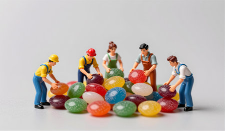 Tiny figures, dressed in bright outfits, collaborate to gather vibrant jelly beans in a fun, imaginative scene. The colorful candies create a joyful atmosphere of teamwork and creativity.