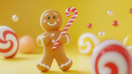 Gingerbread man with candy canes and lollipops on yellow background