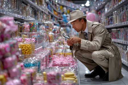 A detective in a trench coat inspects jars of candy in a vibrant sweet shop, focusing on details and colors.