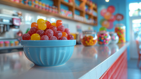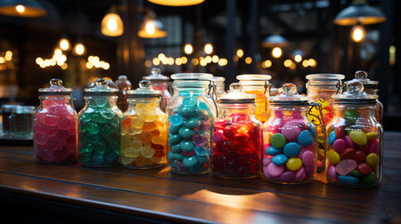 A glass jar filled with colorful gummy candies captures the essence of sweetness and joy in a dynamic candy shop environment, evoking nostalgia.