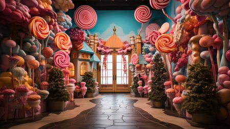 A Christmas candy shop with rainbow lollipops, colorful gingerbread houses, and twinkling fairy lights.