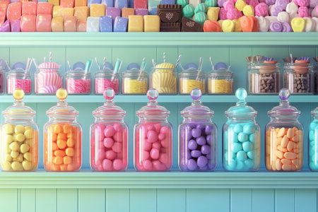 A bright and colorful candy shop interior showcasing rows of vibrant candy jars neatly arranged on shelves. Suitable for candy, sweets, and confectionery themes.