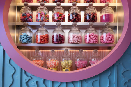 A charming candy shop interior showcasing an array of colorful jars filled with delightful sweets. Perfect for evoking nostalgia and joy in any project.