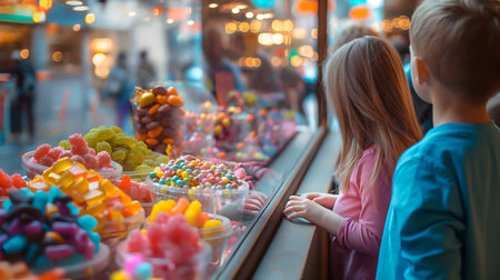 Caucasian children gazing at various candies, gummy jellies, lolly, etc arranged in a variety of compartments