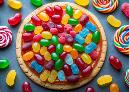 Creative dessert concept featuring a sweet pizza made of a cookie base and topped with vibrant jelly beans, gummy bears, and colorful candy. A playful and imaginative take on classic pizza, ideal for children's menus, party themes, or food blogs.