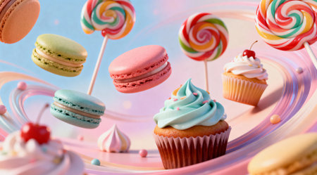A creative digital illustration depicting Abstract food art featuring a symphony of sweets, playful and colorful, soft focus, professional digital art. This AI-generated artwork features unique visual elements suitable for various commercial and editorial applications. AI-generated illustration.