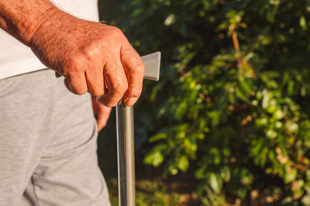 Senior man hands holding stick in park close up