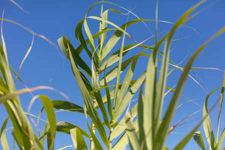 Green leaves of reeds against the blue sky.