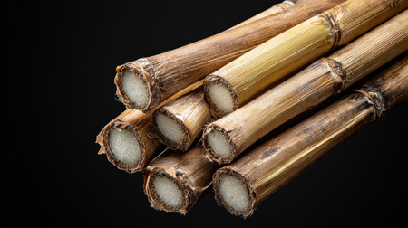 A cluster of sugarcane stalks neatly stacked, side-lit to enhance their natural sheen, displayed on a black background