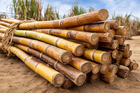 Sugarcane stalks freshly harvested from the field, bundled for processing