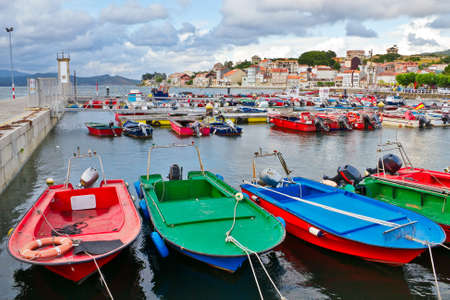 Arosa Island, Spain - 01, 22, 2016: Colored fishing boats moored in the port with the village in the background