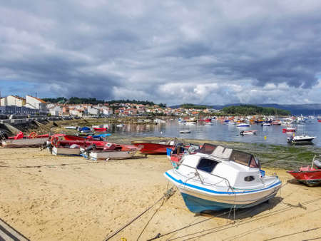 Fishing boats beached on Naval beach in Arousa Island, Galicia, Spain