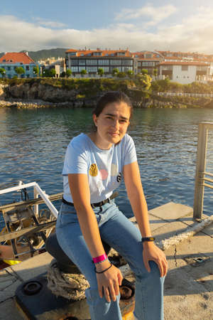 young girl sitting looking at the camera on top of a steel bollard in the sea harbor with boats