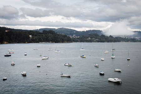 View from the pier with boats at the distance in Sanxenxo Galicia Spain during a summer day