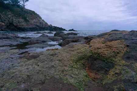 Sea landscape from the shore with storm waves and overcast sky with islands in the background and cliff rocks in the foreground. Relating to weather, storm, winter, travel and tourism