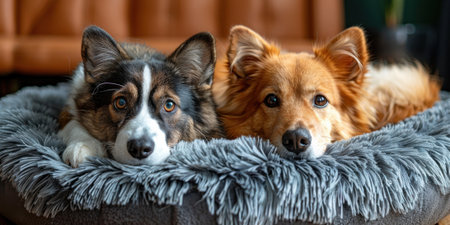 Two dogs relaxing together in pet bed close up in apartment.