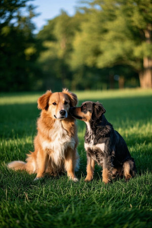 two dogs are sitting on the green grass in the park and kissing