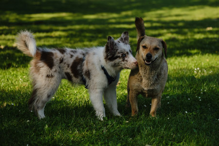 Red merle Border Collie puppy meets a brown mongrel dog on green grass, friendly interaction and playful curiosity outdoors