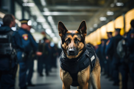 German Shepherd with Vest Sniffing Luggage at an Airport. High quality photo
