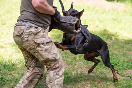 German Shepherd sits and holds his bite sleeve in his mouth. The owner is standing next to the animal. Trainer tries to pull the bite sleeve out of the dog's mouth. Training dogs guard duty.