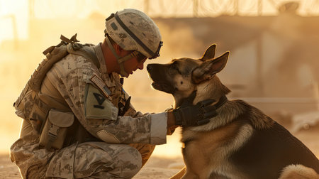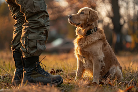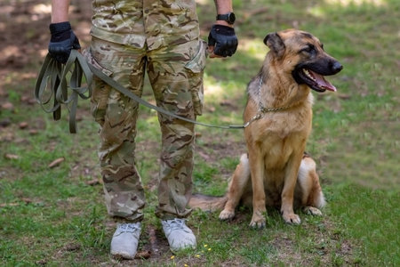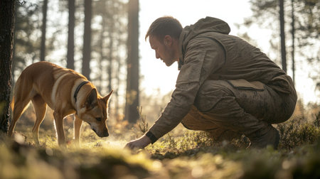 Soldier crouching in forest, training detection dog, fostering teamwork and canine skills in natural environment