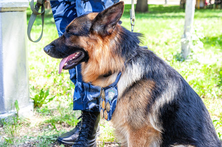 Samara, Russia - May 28, 2016: Police dog of the East European Shepherd breed with medals