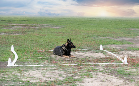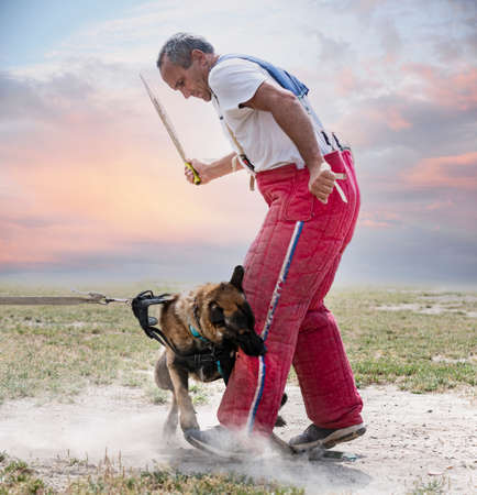 The instructor conducts the lesson with the Belgian Shepherd dog. The dog protects its master.