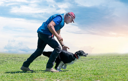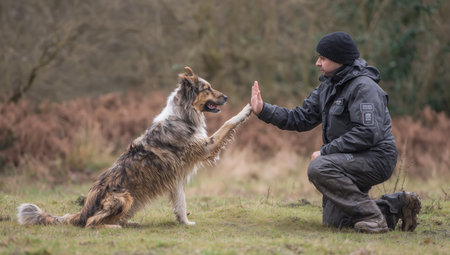 A casual and heartwarming moment between a man and his dog in a natural setting. The dog, a collie, joyfully offers its paw to the man, showcasing their bond.